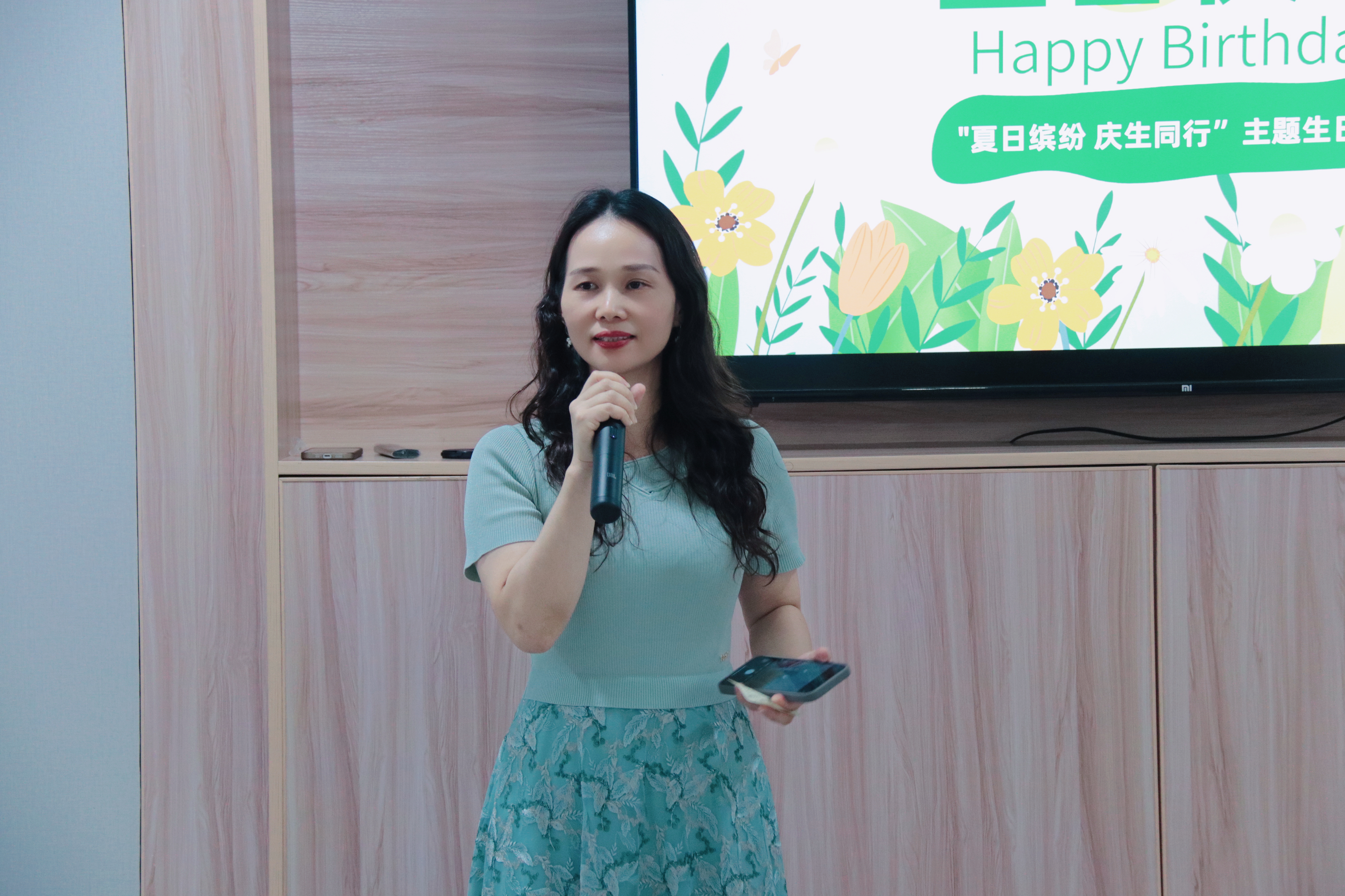 随着主持人饱含暖意的开场白,生日会在温馨的氛围中拉开帷幕。工会主席彭小环首先向寿星们致以真挚祝福,她感慨道:“时光荏苒,转眼已至年中,各工作板块正紧锣密鼓地开展年中总结。当下公司仍在推进几项重点工作落地解决,即便工作繁忙,但公司始终将员工关怀放在心头,每期生日会都希望成为大家卸下疲惫的‘骑士驿站’,让大家暂别忙碌,静享时光。”
